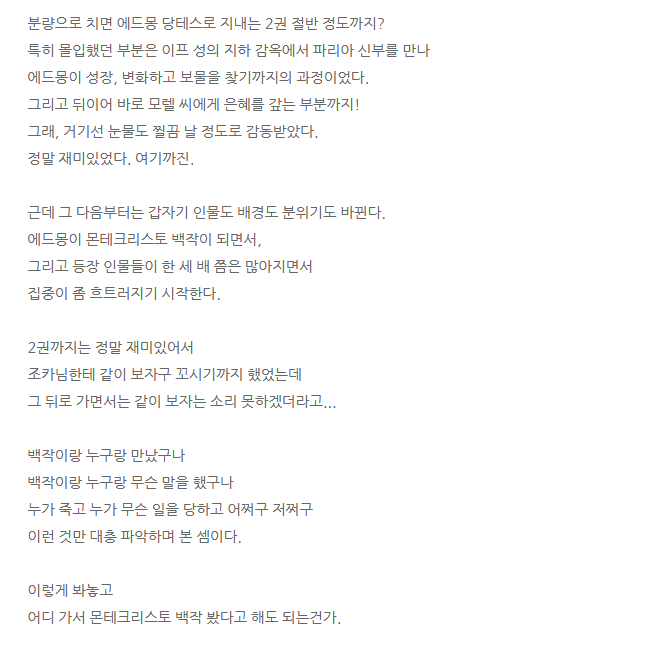 책을 읽을 때 나는 에드몽이 누명을 쓰고 감옥에 갇힌 뒤 파리아 신부를 만나 이런저런 능력을 습득하고 탈출하여 몬테크리스토백작으로 다시 태어남! 그리고 제일 먼저 모렐 씨에게 은혜를 갚음!!! 까지가 제일 재미있었다. 근데 영화에서는 그 부분을 많이 생략하기도 했고(감옥에서 파리아 신부와 보낸 시간), 심지어 모렐 씨에게 은혜를 갚는 부분을 아예 없애기까지 해버려서(!!!!! 내가 제일 좋아하는 부분인데!!!! 나 이때 눈물 찔끔 했었는데!!!!!!) 아아.... 하고 좀 김이 샜다.
